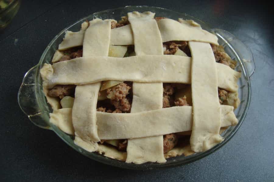 Disponer el relleno sobre la masa, por encima del relleno cubrir con tiritas de la masa reservada. Pincelar con huevo batido y hornear durante 10 a 15 minutos o hasta que el pastel esté cocido y dorado.