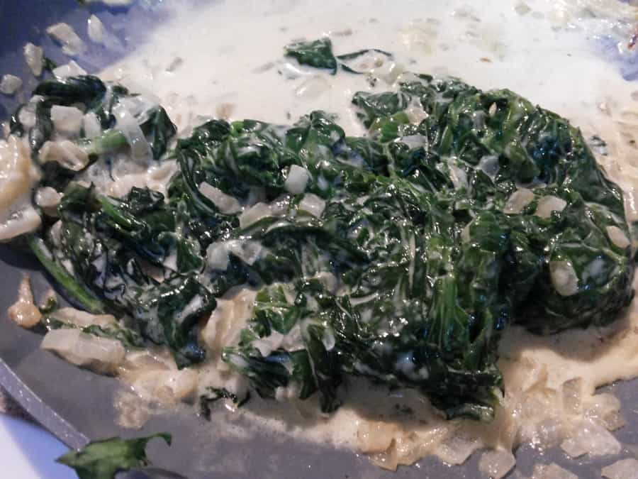 Paralelamente dora las cebollas en una sartén con una pisca de aceite o puede ser también mantequilla. Una vez que las cebollas estén doradas agrega las espinacas y tapa un poco hasta que se duerman. Posteriormente agrega la crema de leche y sala según tu gusto.