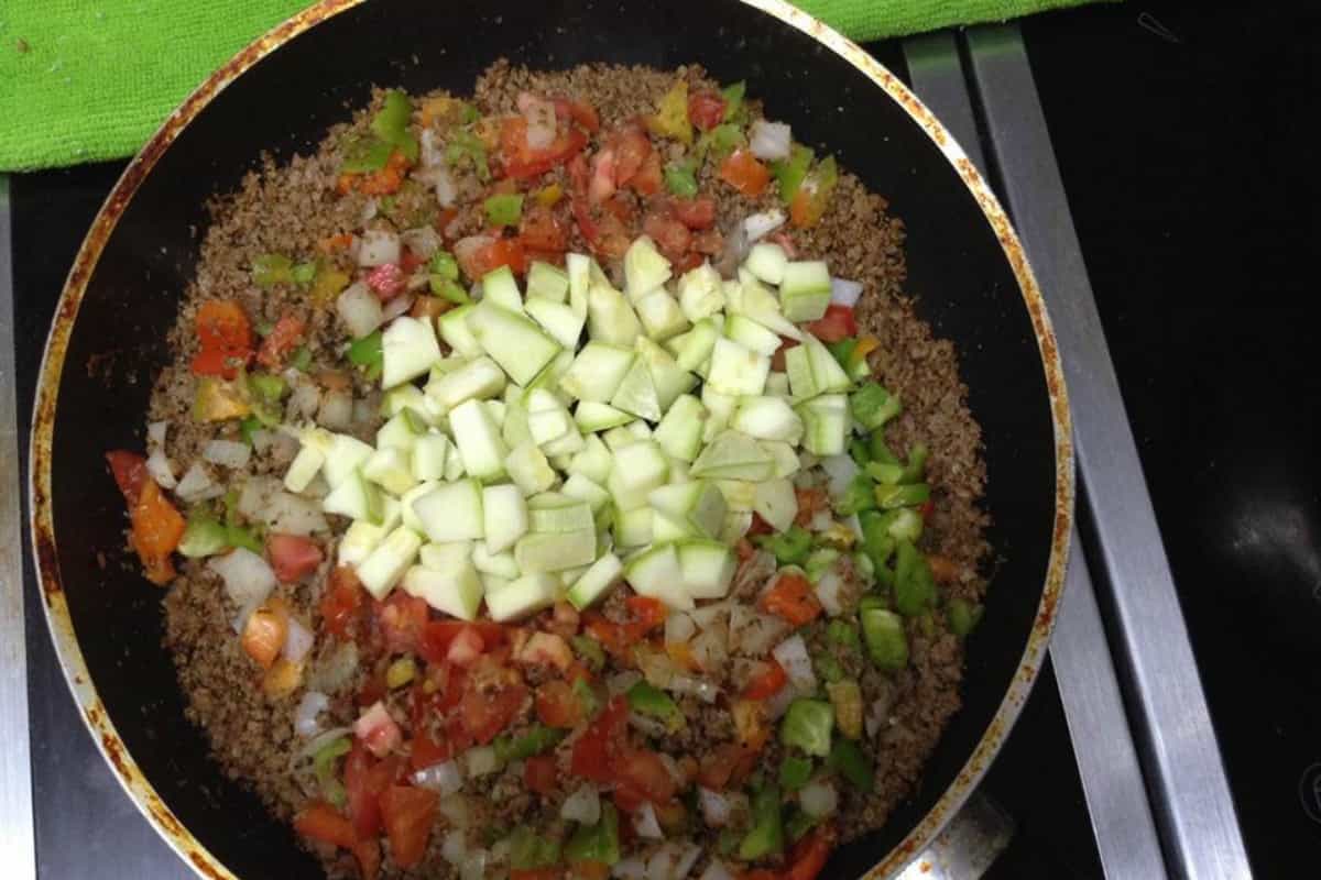 Agregar a la carne molida previamente dorada en el sartén, una cucharada de cada una de las especies descritas en los ingredientes. Cocinar a fuego lento.