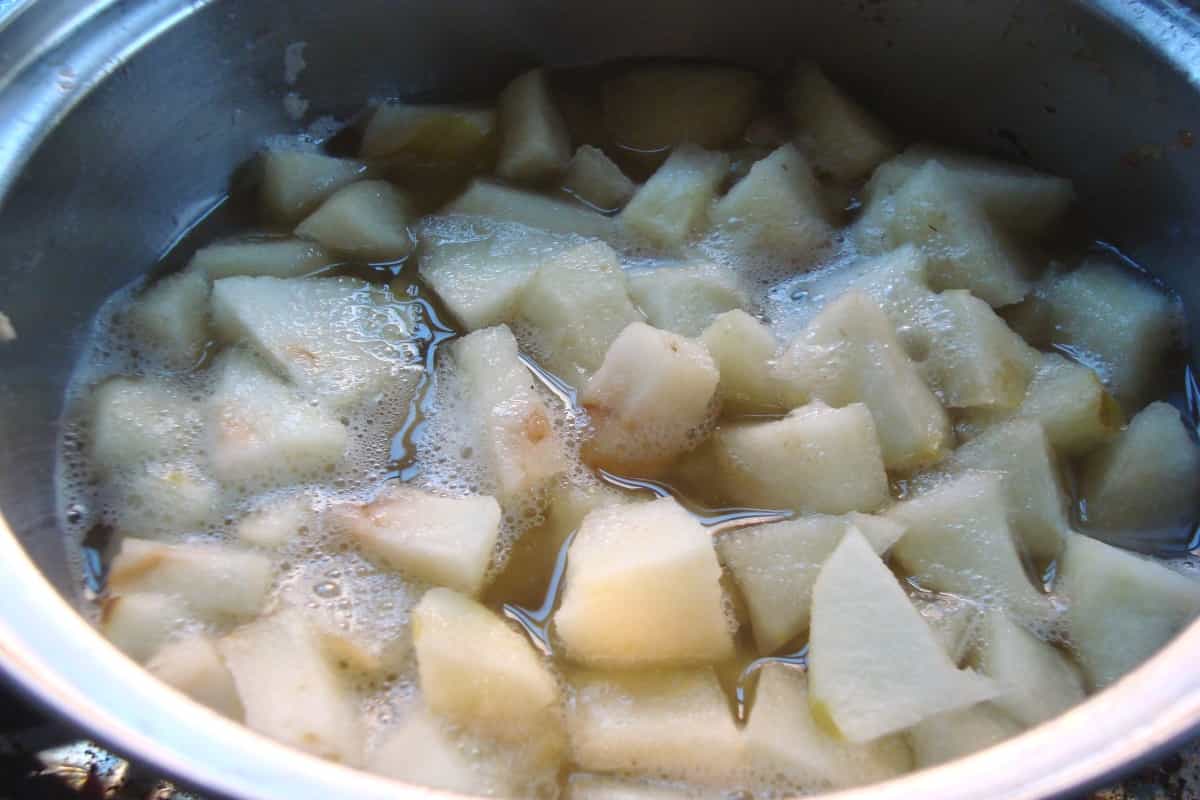 Pelar las manzanas, eliminar las pepas y picarlas en cubos pequeños. Cocinarlas en una olla con 1 taza de agua, 4 cucharadas de jugo de limón, ½ taza de azúcar y miel. Cocinar a fuego alto durante 8 minutos.