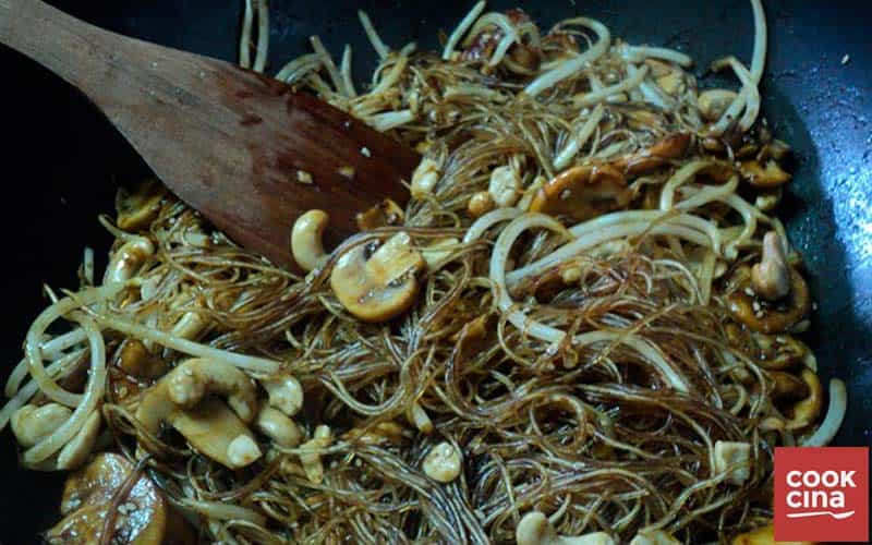 • Cuando la carne esté lista, se agregan las dos cucharadas de ketchup y la salsa de ostras. Los mezclas por unos tres minutos y se le añaden los fideos, el maní o las castañas de cajú y el diente de dragón.