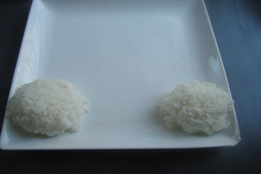 Armar la ensalada, para esto con las manos tomar una porción de arroz y formar una bolita, aplanarla un poco para darle la forma de una nube, disponer en un costado del plato, repetir la operación y colocar la nube de arroz al otro costado del plato.