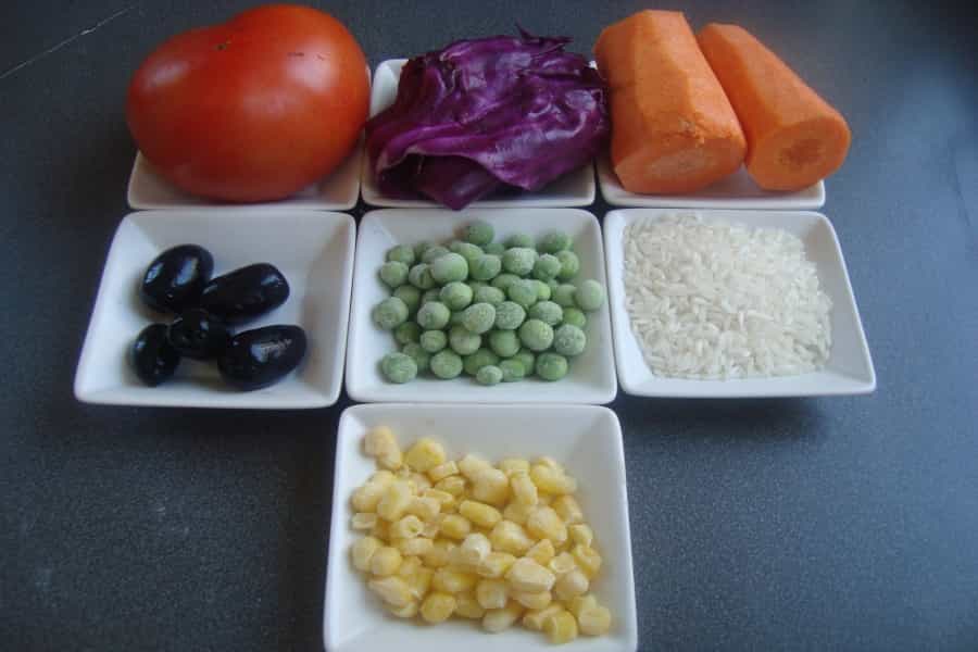 -1 taza de arroz -100 gramos de choclo en grano congelado -100 gramos de arvejas congeladas -2 zanahorias -2 tomates -3 hojas de repollo morado -4 aceitunas -Sal - Aceite Preparación Preparara el arroz: en un sartén con aceite de caliente saltear el arroz por 2 minutos, agregar 1 ½ taza de agua caliente, sazonar a gusto y revolver, cocinar tapado sobre el tostador por 15 minutos. Apagar y reservar. En una olla con agua caliente cocinar las arvejas y el choclo, por 15 minutos o hasta que estén blandos. Eliminar las durezas del repollo morado, picar en tiras, remojar en un pocillo con agua por 10 minutos. Escurrir las arvejas, los choclos y el repollo y reservar. Pelar la zanahoria y el tomate, cortar la zanahoria en rodajas, dividir las rodajas de tomate en 4 partes.
